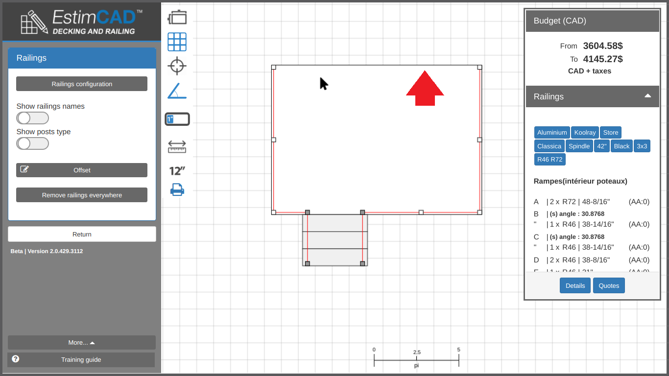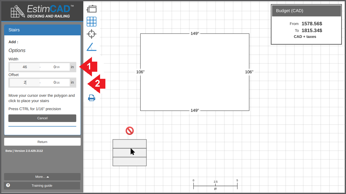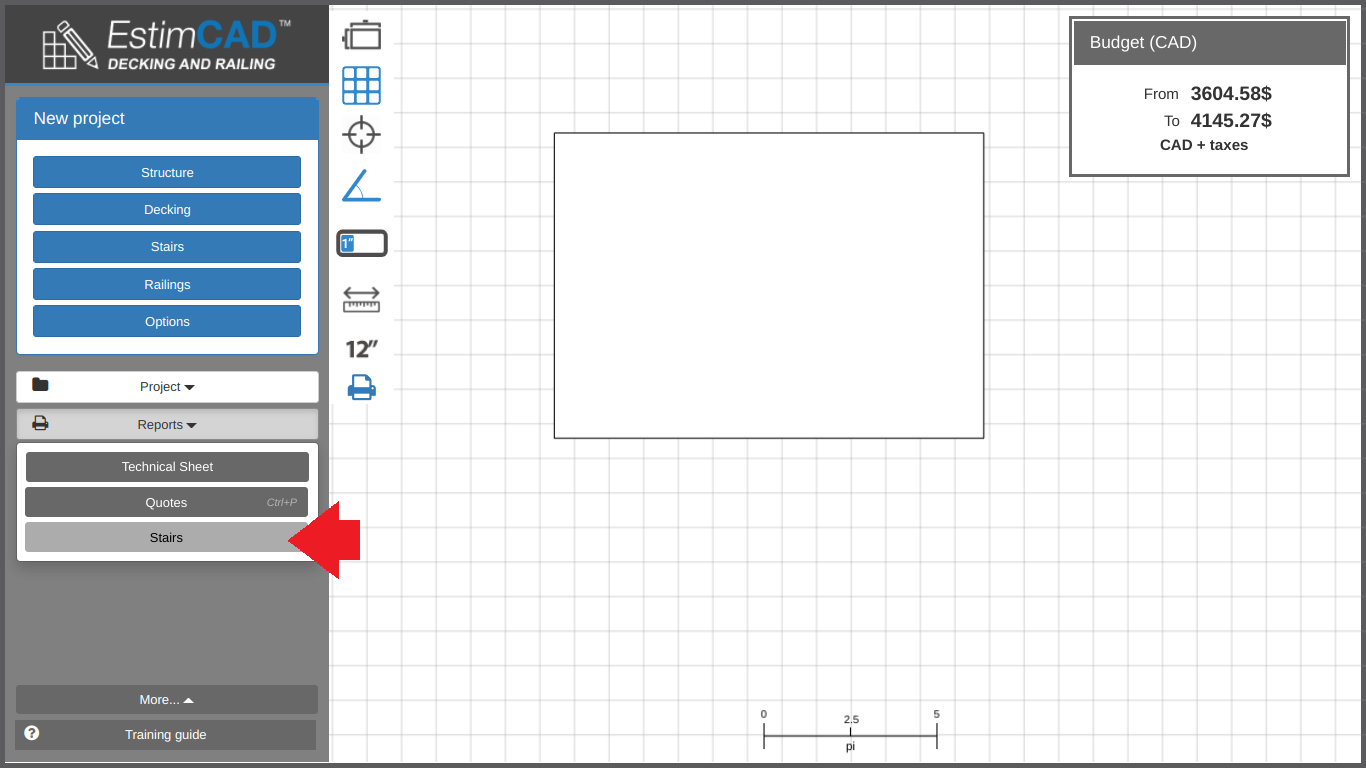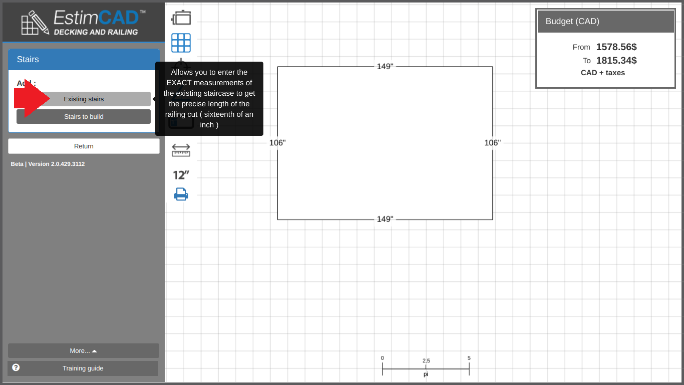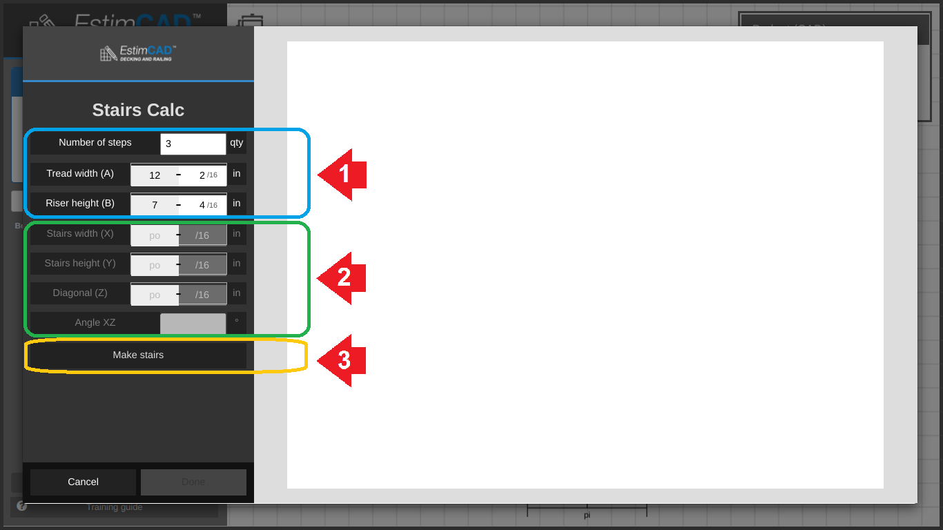 Arrow 3 = Once the existing measurements are registered, click the "Make stairs" button.